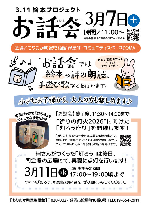 | 開催場所 | もりおか町家物語館 母屋1F コミュニティスペースDOMA(お話会:会場) |