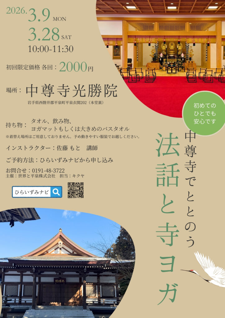 We will be holding a yoga event at the World Heritage Site, Chusonji Temple, combining sermons with gentle yoga.