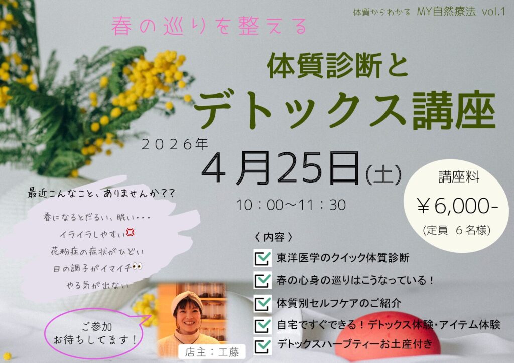 【4/25(土)】〜春の巡りを整える〜 体質診断とデトックス講座☆