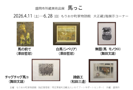 大正蔵1階の展示コーナーにて、盛岡市所蔵美術品の展示を定期的に開催します。今回は、今年の干支の馬を描いた作品を展示します。澤田哲郎(盛岡市神子田町出身)、舞田文雄(一関市出身)、和田三造(兵庫県出身)の作品です。ぜひご覧ください。
